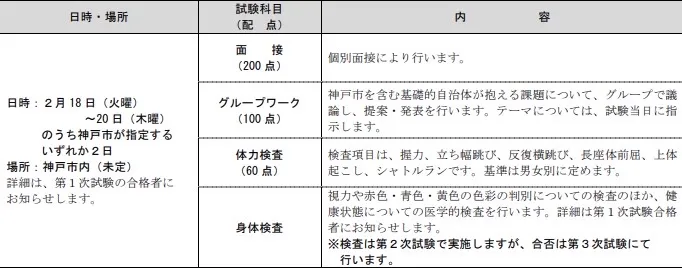 例えば神戸市では2次試験以降の試験日程は下記のように記載されています。